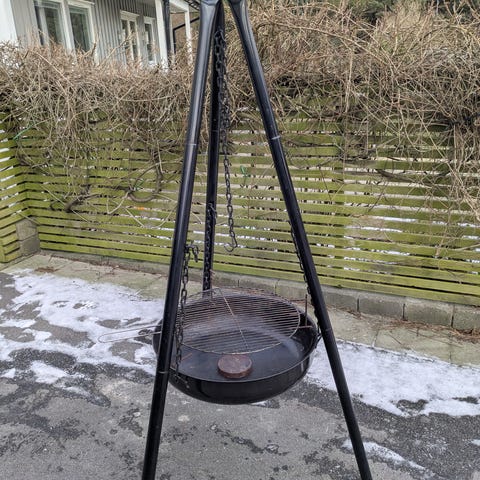 Four Seasons grillstativ med oppheng til grillrist for utendørs bruk. Stativet består av et trekantet stativ i metall med kjettingoppheng for grillrist. Egnet til grilling over bål eller åpen ild på tur, i hagen eller ved hytta. Kan brukes sammen med rund grillrist (ikke vist tydelig på bildet) som henges i kjettingene for justerbar høyde over varmekilden.