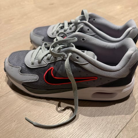 Nike Air joggesko for barn/ ungdom i størrelse 36 (EU). Skoene er i hovedsak hvite med røde/ rosa detaljer og synlig luftpute i hælen. Overdelen er i tekstil og syntetisk materiale, med lisser for justering og god passform. Yttersålen er i gummi.