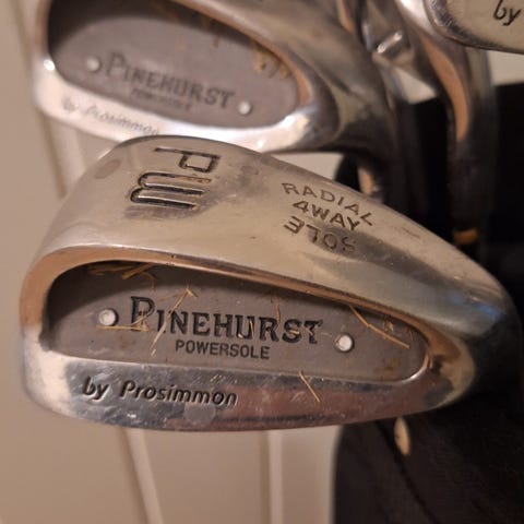 Settet består av Golfbag, 1 stykk Wood, 2 stykk hybrid, 7 og 9`er jern, Sandwich og putter.