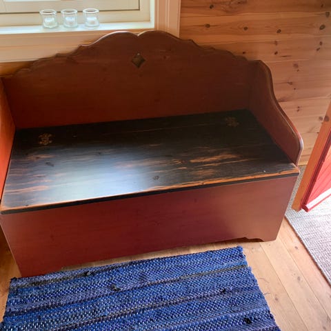 Hvit benk med oppbevaring i tre. Benken har ryggstøtte og armlener med sprosser. Setet kan vippes opp og gir tilgang til et romslig oppbevaringsrom under, egnet til for eksempel puter, leker eller sko. Klassisk, rett design som passer i gang, stue eller soverom.