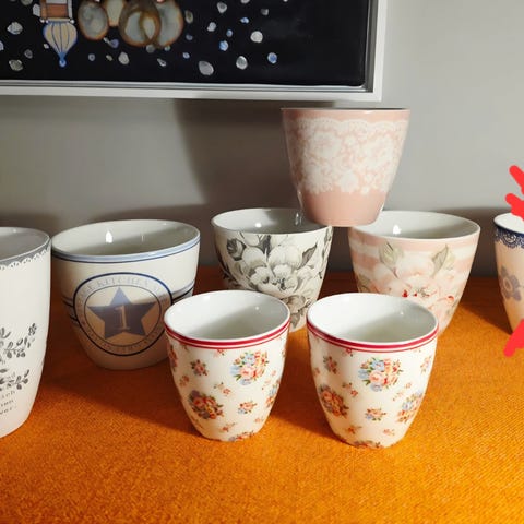 Krus fra Greengage med mønster i fargen rosa og rød.