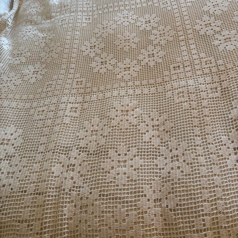 Heklet sengeteppe i hvit bomullsfarge. Teppe med tett, gjennomgående mønster av runde og geometriske hekleruter som er satt sammen til et helhetlig felt. Avsluttes med bølget kant nederst. Passer som sengeteppe eller stort pledd over seng eller sofa. Materialet fremstår som bomullsgarn eller lignende naturfiber. Ingen synlige merker eller logoer på teppet.Str 240-190