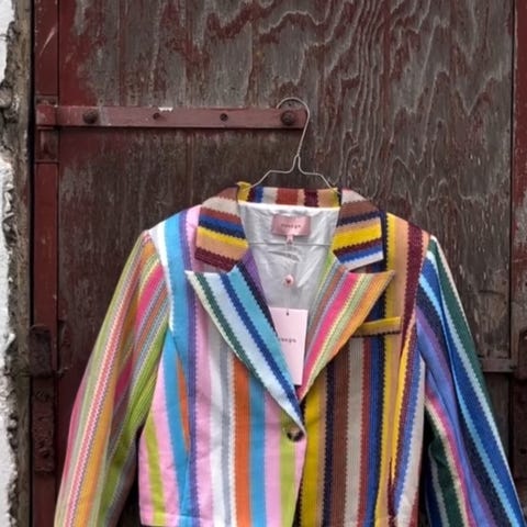 Materiale ifølge lappen er hovedsakelig bomull med noe elastan for stretch. Egnet som lett jakke eller overdel til hverdagsbruk. Vaskes på 40 °C etter anvisning på vaskelappen.