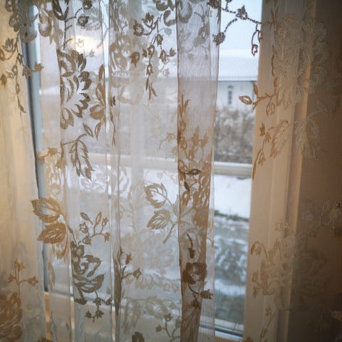 Tynne tyll, nylon gardiner, med blomstermotiv og rysjekanter.