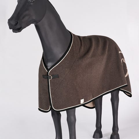 Helt nytt ullteppe til hest, fra merket BVertigo. Teppet har bilde av en hest, med bitt-ramme rundt i grå/svart.