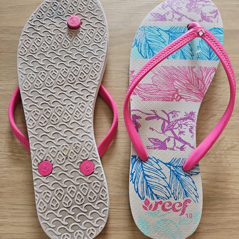 Fine og ubrukte flip flops fra Roxy i silkelignende tøystoff - farge mørk blå og rosa (passion fruit).