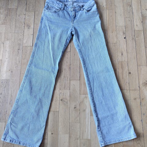 Fin jeans i sommer farge, flare mod, W 30, Lagt opp til lengde 75 cm i fot. En løs tråd, se bilde.