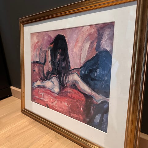 Selger en nydelig reproduksjon av Edvard Munchs ikoniske maleri «Modell ved kurvstolen» (malt ca. 1919–1921).