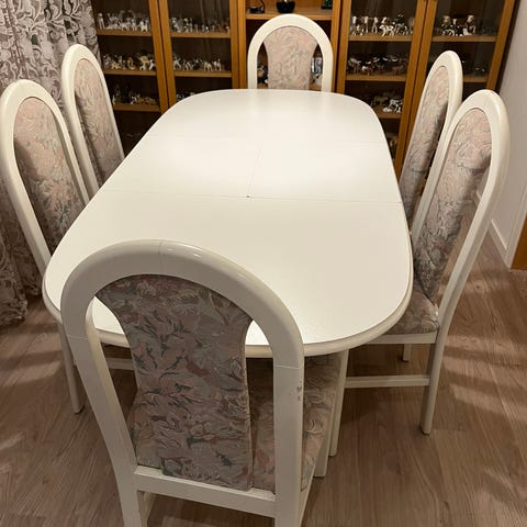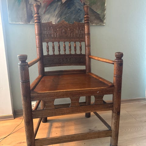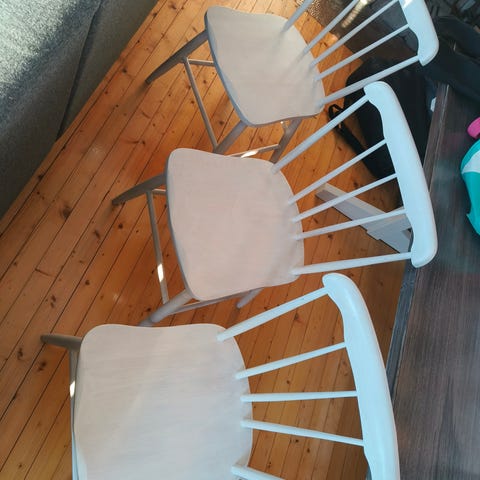 Gammel solid hvitmalt pinnestol med fin linjer.