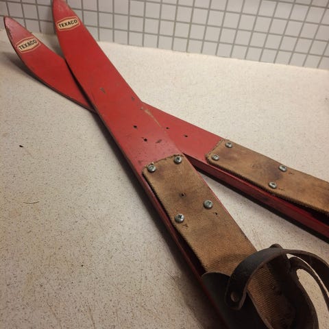 Dette er en sjelden sjanse til å sikre seg et stykke norsk skihistorie. Skiene har en fantastisk patina og originale bindinger i lær og metall som fortsatt er intakte.