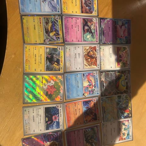 Lotten inneholder flere japanske Pokémon-kort med illustrasjoner av både trenere og Pokémon. Bildene viser blant annet full art-trenerkort, EX-kort og andre holografiske kort i standard samlekortstørrelse. Kortene har japansk tekst og motiv fra ulike serier/utvidelser.