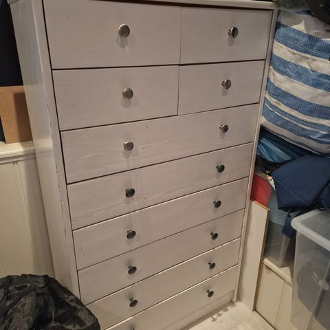 Godt brukt. Trenger litt tlc. Var tidligere teakfarget. Skuffene er lette å åpne.