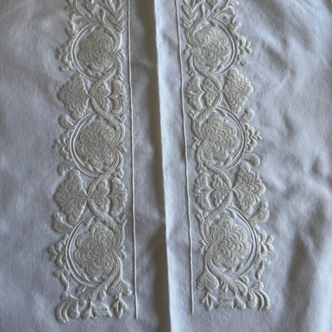 Plattsømbrodert hvitt på hvitt bryst til skjorte selges kr 1000,-