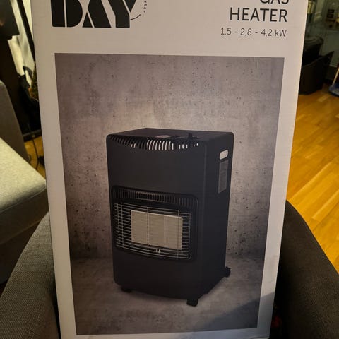 Frittstående gassovn i grå utførelse. Ovnen har frontmontert varmefelt med beskyttelsesgitter og er utstyrt med hjul for enkel forflytning. På toppen finnes betjeningsknapper for tenning og regulering av flamme. Baksiden har plass til gassflaske og tilkobling med ventil og slangefeste. Egnet som tilleggsvarme i godt ventilerte rom, garasje eller hytte der bruk av gassovn er tillatt. Brukeren må selv sørge for korrekt gasslange, regulator og sikker tilkobling i henhold til gjeldende forskrifter.