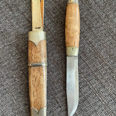 Tommeliten barnekniv med slire og trehåndtak. Kniven leveres i gaveeske med tilhørende lærslire med metallbeslag. Skaftet er i tre med metallkappe, og bladet er kort og tilpasset barn/dame. Nypris kr 3075,-