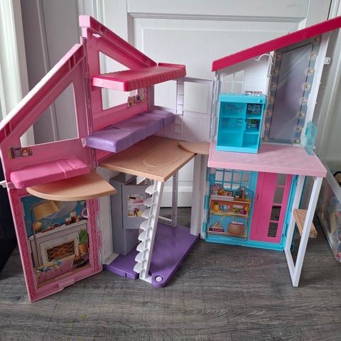 Lekehus der taket kan tas av dører lukkes opp og igjen. Her har det hvert brukt til Barbie hus.