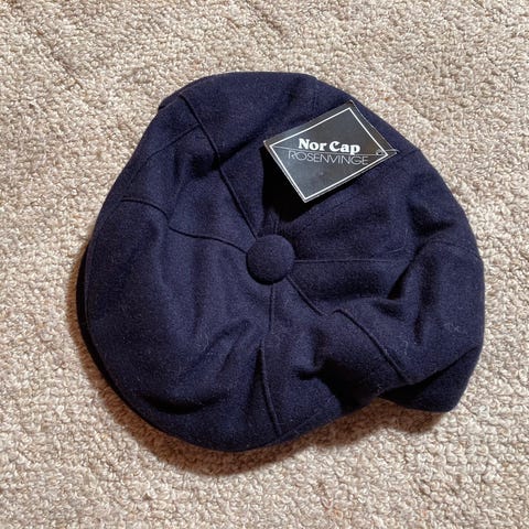 Vintage sixpence lue fra Opplandske Luefabrikk Gjøvik. Størrelse 59. Med ørepropper og brem med knapp. Koksgrå,