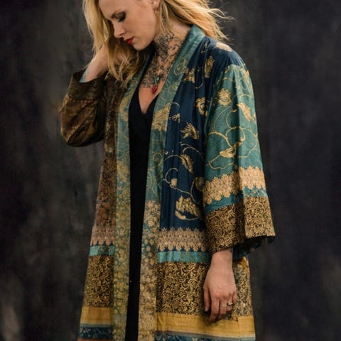 Veldig pent sett med skjørt og vest i fargene brunt, grønt og beige. Mykt og komfortabelt stoff; 40 % polyester, 38 % ull og 12% angora. Klesmerket TIINA er finsk design, og settet ble kjøpt på slutten av 1970- tallet eller begynnelsen av 1980- tallet. Finsk størrrlse 34 tilsvarer i de fleste tilfeller europeisk størrelse XS og norsk størrelse 34. Er usikker på om dette også gjaldt for 50 år siden, men settet er brukt av undertegnede som brukte størrelse XS og S på den tiden. Skjørtet er foret og har A-fasong; kanskje klokkefasong. Glidelås og trykknapper bak. Vesten er uforet. Besetningene langs kanter samt lommer er i myk speilfløyel eller lignende stoff.