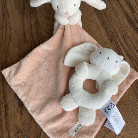 Myk sutteklut med bamse fra Newbie. Perfekt sutteklut til babyen, med en liten fastsydd kosebamse. Alle lekene er barnesikre, noe som innebærer at alle sømmene er testede og drasikre.