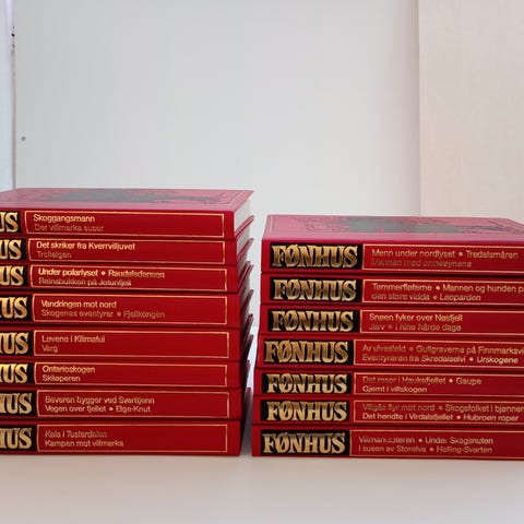Fonthus bokserie innbundet i rød rygg. Bøkene står samlet i en serie med lik utforming og gullfarget skrift på ryggen. Serien leveres i kassett med portrettmotiv på siden. Egner seg som samleutgave i bokhylle for lesing og oppbevaring av forfatterens verker.