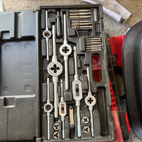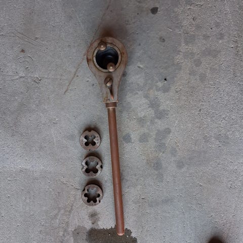 Dette er en Archer gjengeapparat med 1MT reversibel friksjonsdrift, et verktøy som brukes til å skjære gjenger i metall ved hjelp av en boremaskin eller dreiebenk.
