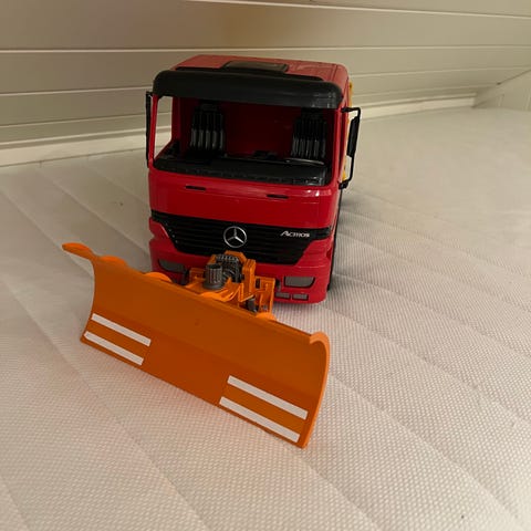 En kombinert brøytebil og strøbil. Sand eller salt. Til lek inne og ute.