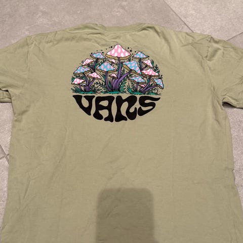 Selger en pent brukt T-skjorte fra vans i str XS/S - t-skjorten er merket som 7/XL, men tilsvarer ca XS/S i passform. T-skjorten er 100% polyester, den er pent brukt og i god stand.