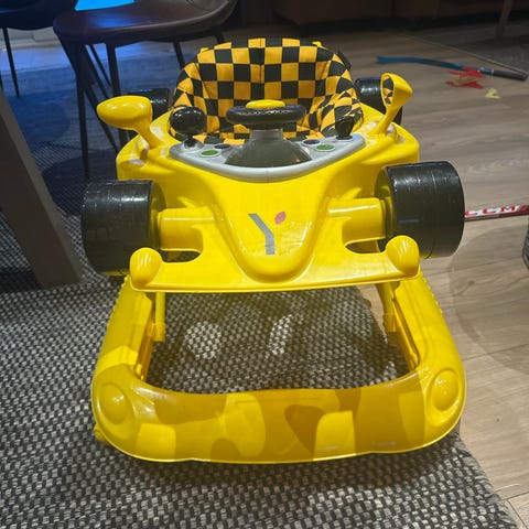 Sammenleggbar og høydejusterbar gåstol fra Yngri til baby som skal øve seg på å gå. Har vært til mye glede her i huset, bortsett fra at lyden hang seg opp etter litt vannsøl og gikk på repeat noen døgn. Lyden er derfor nå skrudd av, mulig man kan få den til å funke igjen. Har tatt ut alt av knapper og deksel og vasket nedi.