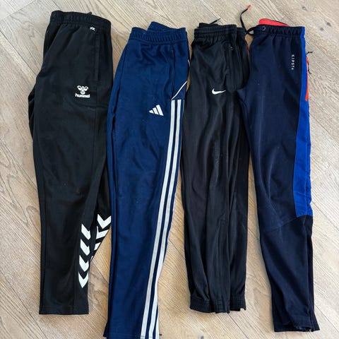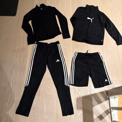 Adidas Hummel Umbro Puma fotballklær for barn i størrelse fra 11 år, ca 152. Pakken består av flere fotballplagg, blant annet lange treningsbukser og shorts i svart og hvit farge. Klærne er laget i typiske tekniske materialer for fotball og egner seg til trening og aktivitet for barn i denne størrelsen.