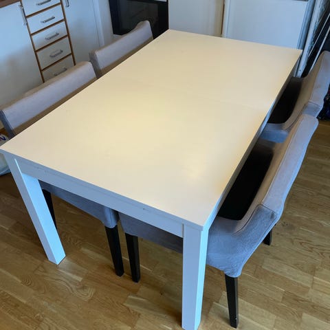 Selger vårt stilrene EKEDALEN spisebord fra IKEA i hvitt, sammen med fire moderne LIDÅS stoler (modell med metallben). Alt kjøpt nytt i 2020 og har vært lite brukt – meget pent brukt uten skader eller riper. Selges pga flytt!