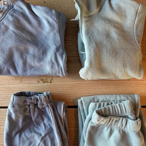 Pakke med tre matchende sett str. 92 (2 år) selges samlet. Bukse og gensere. Buksene kan strammes i livet med strikk for bedre passform.