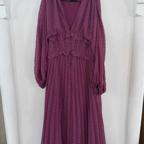 Selger en kjempefin lys gul kjole med delikat mønster i stoffet. Kjolen har korte puff-ermer og faller fint i skjørtet med lett plissert effekt. Veldig flatterende passform!
