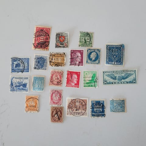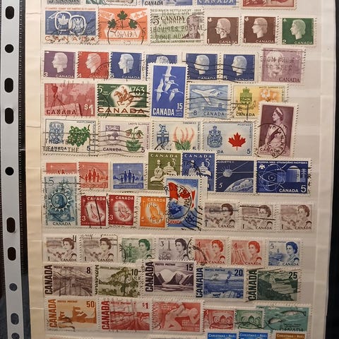 Frimerkesamling med eldre frimerker i ulike farger og motiver. Frimerkene er montert i et innstikksalbum/innstikksark og fremstår som brukte eksemplarer med stempler. Egnet for samlere som ønsker en blanding av ulike motiver og årganger i én samling.