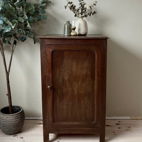 Dette er et tungt og stødig skap med god oppbevaringsplass og et uttrykk som kan tilpasses rom og stil. Kan brukes som skjenk, oppbevaring i stue eller gang, eller som et dekorativt møbel med både funksjon og historie.