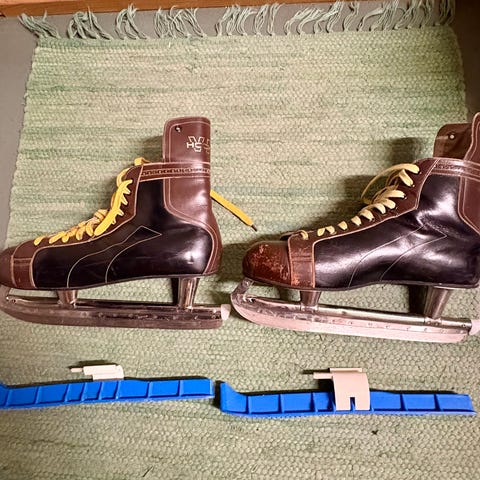 Hockey Canada ishockeyskøyter i størrelse 46. Nesten ikke brukt. Skøytene er i hovedsak sølv med svarte detaljer og svart skøytestålramme. Overdelen har snøring foran for justerbar passform. Modellen er egnet til ishockey og generell bruk på is, for eksempel trening eller fritidsbruk. Skøytene har stiv polstret ankelparti for støtte og komfort under bruk. Stålet er som nytt- aldri slipt