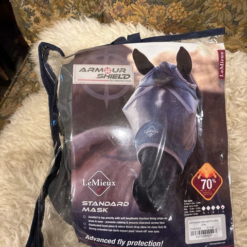Comfort Tech Lyoma fluemaske i blå farge. Kun prøvd på men passet ikke hesten. Den har tettsittende passform rundt hodet og er laget i et pustende materiale som gir god komfort.