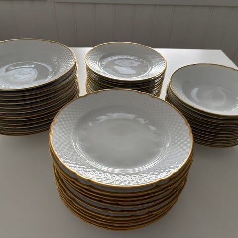 Lite hvit fat uten gullkant 25x17cm 200kr. Lite fat med gullkant 23,5x15,5cm. 150kr. Potetskål 25x25cm 200kr. Kan selges separat.