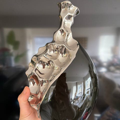 Dekorativ teddybjørn formet som en sittende med integrert skål. Figuren har blank sølvfarge, mens skålen har gullfarge. Passer som borddekor, nøkkelskål eller til småting i entré, stue eller kontor. Laget i trolig keramikk materiale med filt under for stabilitet på bordflate. Er også en sparebøsse / sparegris. Passer inn i et moderne interiør. Eller på barnerom. Ukjent fabrikat