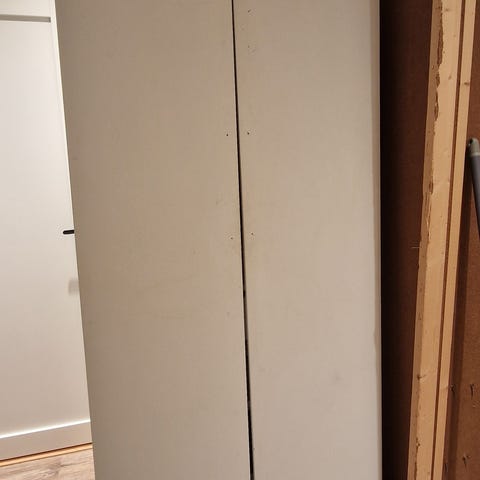 3 skap fra Ikea med hyller. Hvit laminat og malt utenpå i grønn. Et skap har bein.
