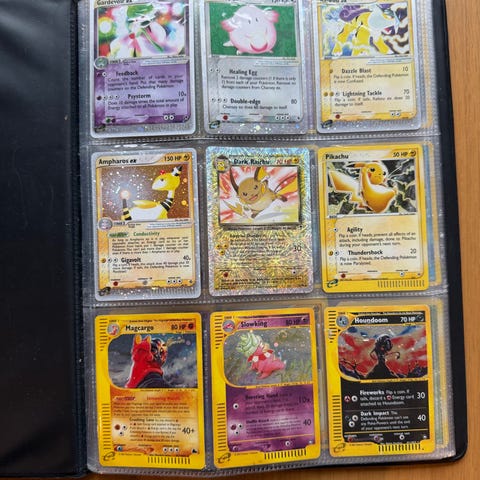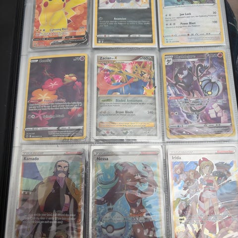 Pokémon samlekort samling i album. Bildene viser et utvalg kort, blant annet ulike holografiske og full art-kort, energi-kort og kort fra forskjellige serier og utgivelser. Kortene ligger i plastlommer i et samlealbum, som følger med. Egner seg for samlere av Pokémon TCG som ønsker en variert samling med flere forskjellige motiver og typer kort samlet på ett sted.