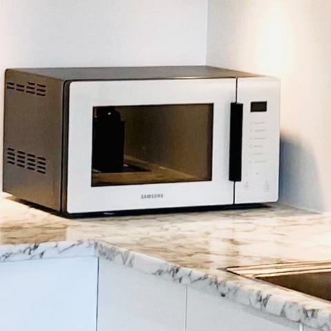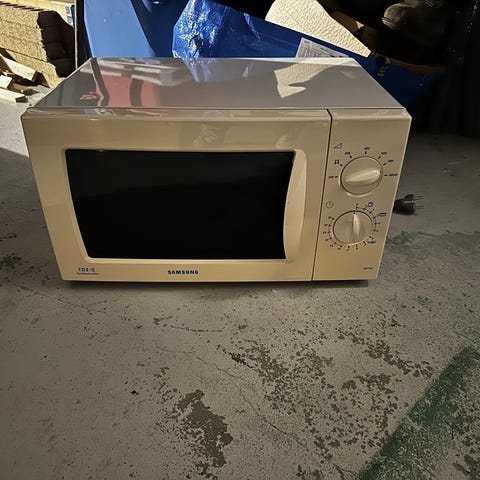 Samsung mikrobølgeovn i svart utførelse. Frontpanel med dreiehjul for innstilling av tid og flere forhåndsinnstillinger for ulike mattyper. Innvendig roterende rist og plastbolle følger med etter bildene. Egnet til oppvarming, tining og enkel tilberedning av mat i hjemmet, på hytta eller i andre kjøkkenløsninger hvor det er behov for en standard mikrobølgeovn.