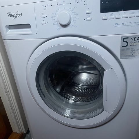 Whirlpool vaskemaskin. Modellen har frontåpning med glassluke og betjeningspanel med dreiehjul og display. Maskinen har flere vaskeprogrammer som kan tilpasses ulike tekstiler og behov. Passer til vanlig bruk i husholdning for vask av klær, håndklær og sengetøy. Ukjent alder. På noen programmer sentrifugerer den noe dårlig, da har vi brukt eget program for sentrifugering etterpå og det har fungert. Selges billig på grunn av dette. Må hentes og bæres ut selv (1. etasje og ingen trapper)