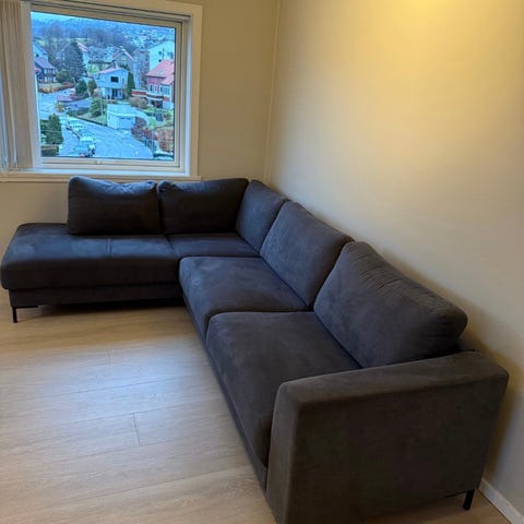 Sofaen er grundig renset med tekstilrenser, så den er frisk og klar for nytt hjem