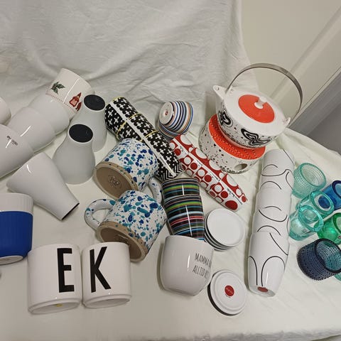 Tesett for 6 personer. Hovedfarge er mer gul (sitron) enn på bilder, med retro mønster i brune farger. Fremstår som ny med unntakk av en liten skade på en kopp og skjønnhetsfeil i glassuren (fra produksjon). Fri for misfarging, klakkelering osv.; 2,5dl.