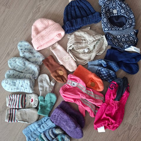 Skjerf, luer, hjemmestrikket sokker og voter. Refleks votter og andre votter.