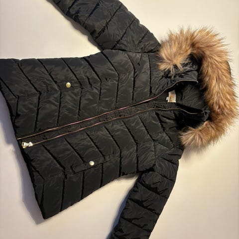 KappAhl jakke for jente i størrelse 134. Jakken er svart med gulldetaljer. Den har hette med fuskepels, glidelåslukking foran og to glidelåslommer i siden. Quiltet mønster gir jevn fordeling av vattering. Passer som ytterjakke i kjøligere vær.