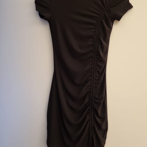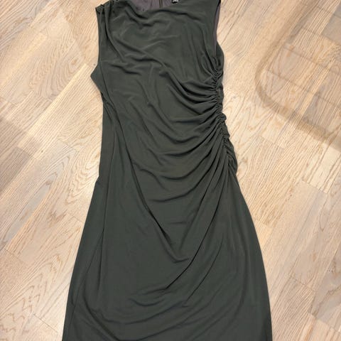 Zara festkjole i brun farge for dame i størrelse L. Kjolen er ermeløs og laget i polyester. Den har draperinger og rynkedetaljer i sidene som gir en asymmetrisk effekt. Passer til fest og andre anledninger der man ønsker en enkel, figurnær kjole i lett materiale.