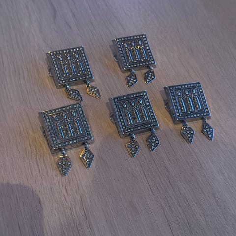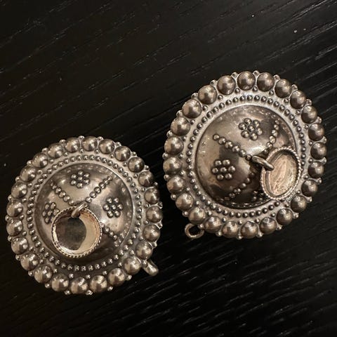 Bunadsølv i oksidert sølvplett( sølvbelagt med ekte sølv) Brystsølje D 6,9cm Halssølje D 4 cm Mansjettknapp D 2 cm