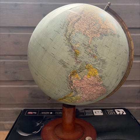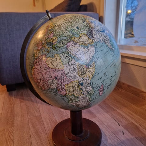 Scan-Globe TP-11 globuslampe med innebygd belysning. Globusen viser verdenskart med land, hav og geografiske navn. Lampen står på en rund fot i tre med metallfeste og har strømkabel med bryter. Egnet som bordlampe eller dekorasjon, samt til enkel geografisk orientering.