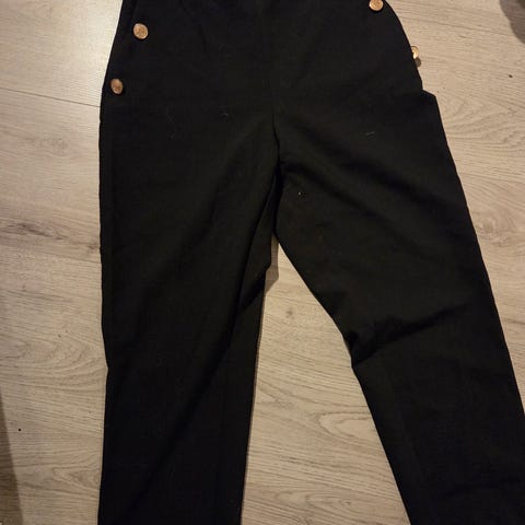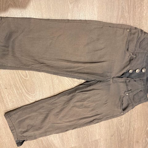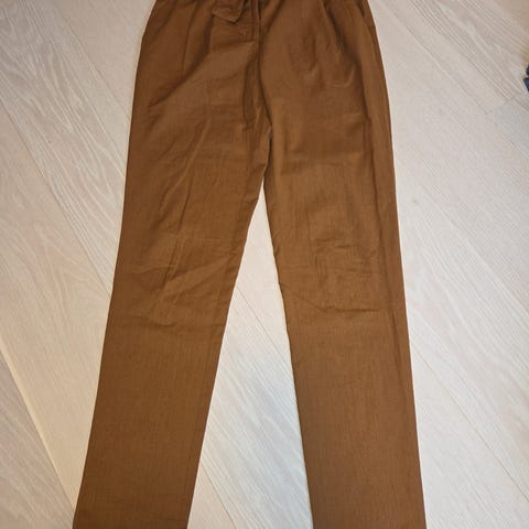Buksen er så vidt prøvd på, men er desverre for stor. Fin paperbag fasong hvor den er loose fit men smalner nedover beina. Har stretch stoff på baksiden av leggen for å sitte fint uansett fasong på leggen.